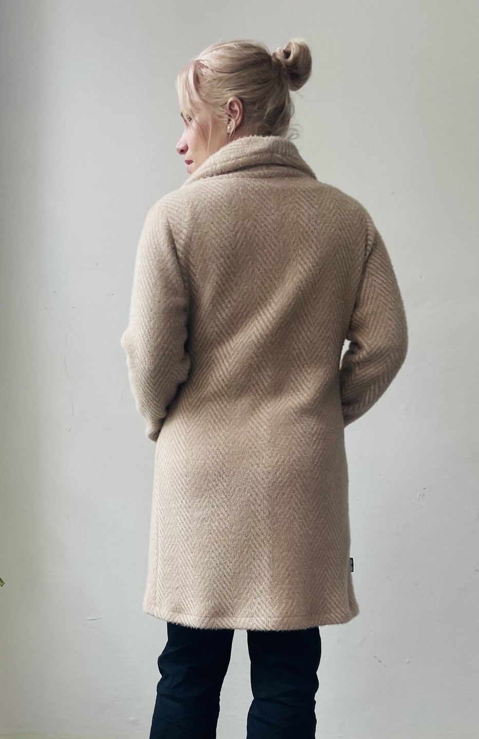 Dámský béžový kabát s klopami, praktickými kapsami. Hřejivý materiál na přechodová období. Jemné rýhování. Směs akrylu. Přezka.
