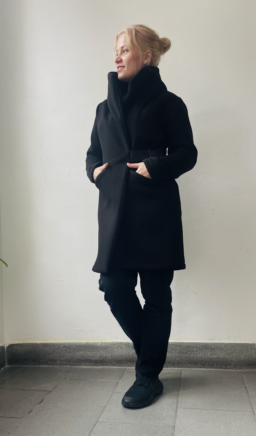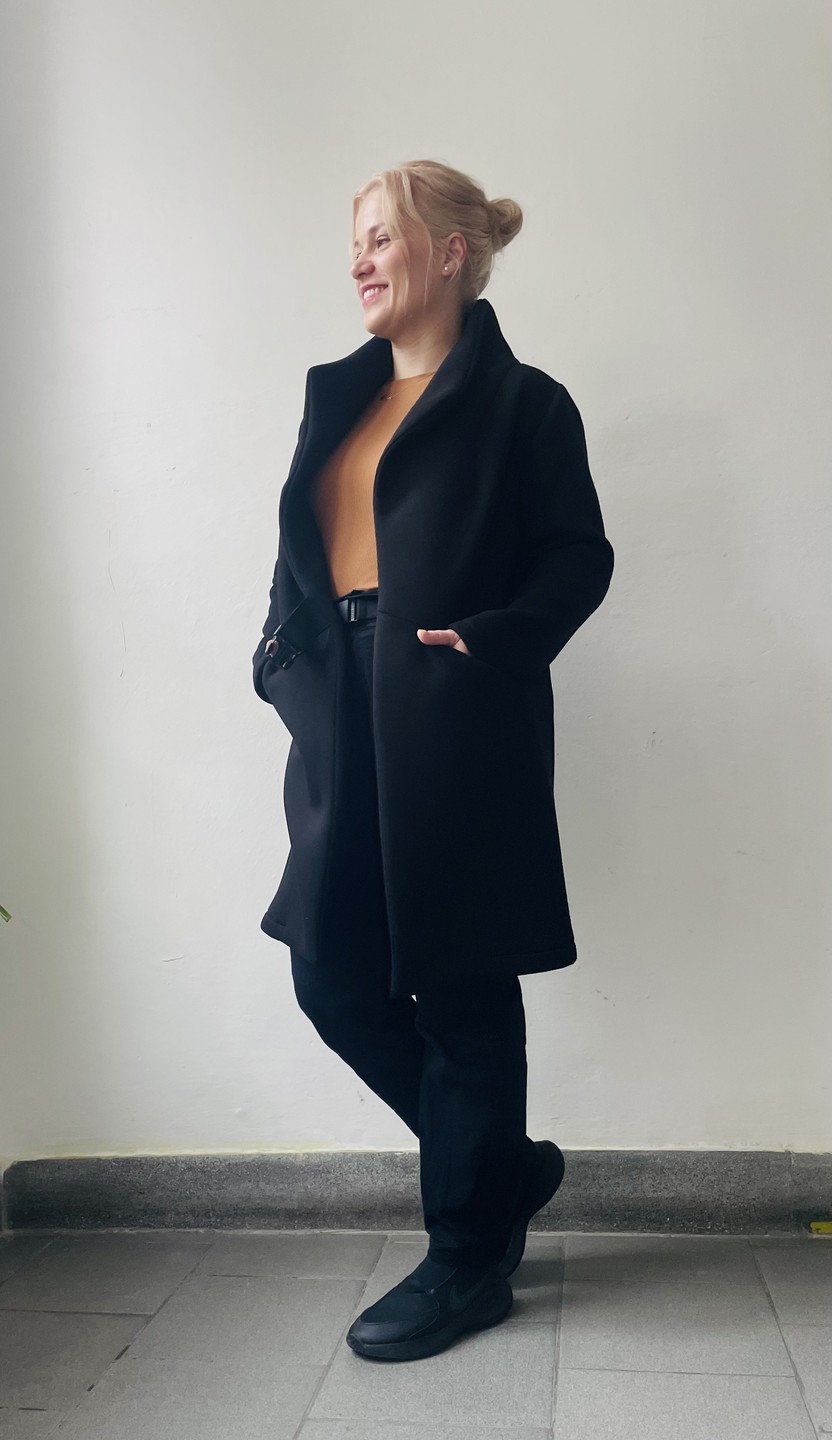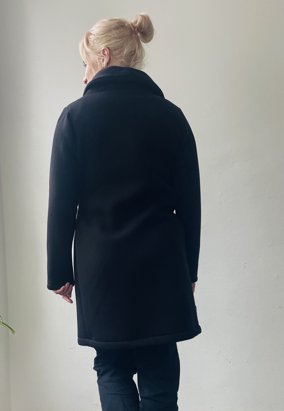 Dámský černý kabát s klopami, praktickými kapsami. Hřejivý materiál na přechodová období. Hutná počesaná mikinovina. Přezka.