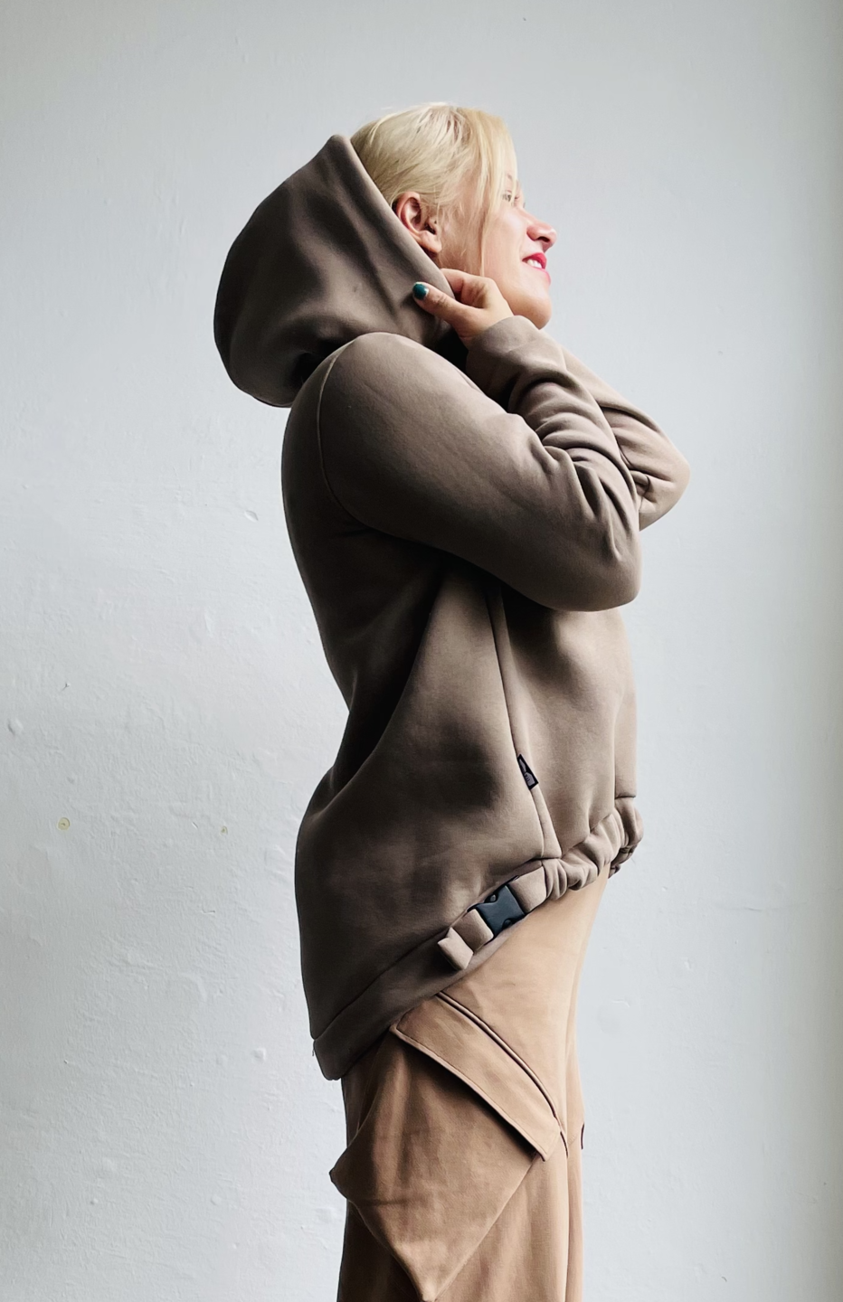 Volná dámská béžová mikina s kapucí, nabíraným spodním lemem, delším zadním dílem.