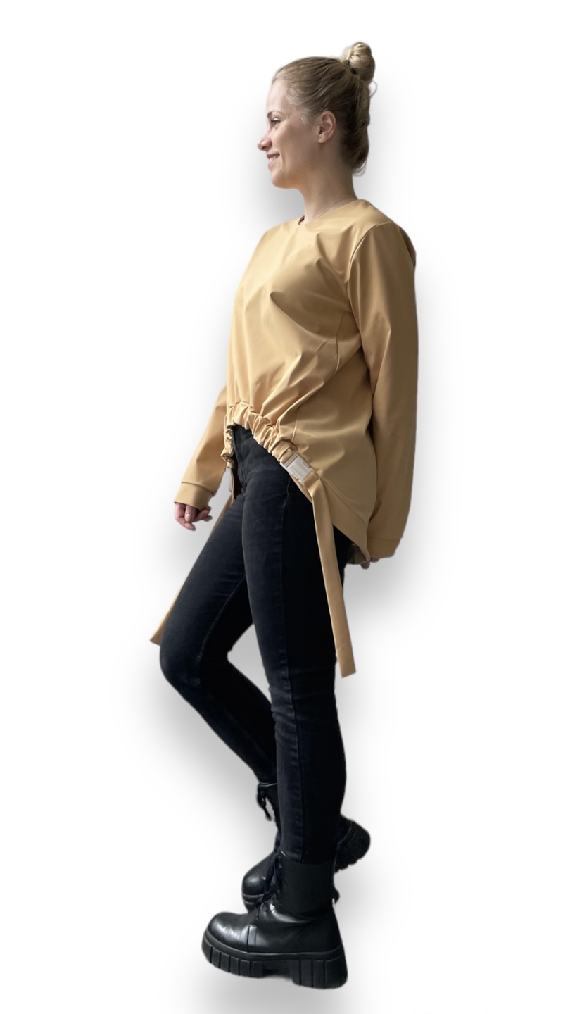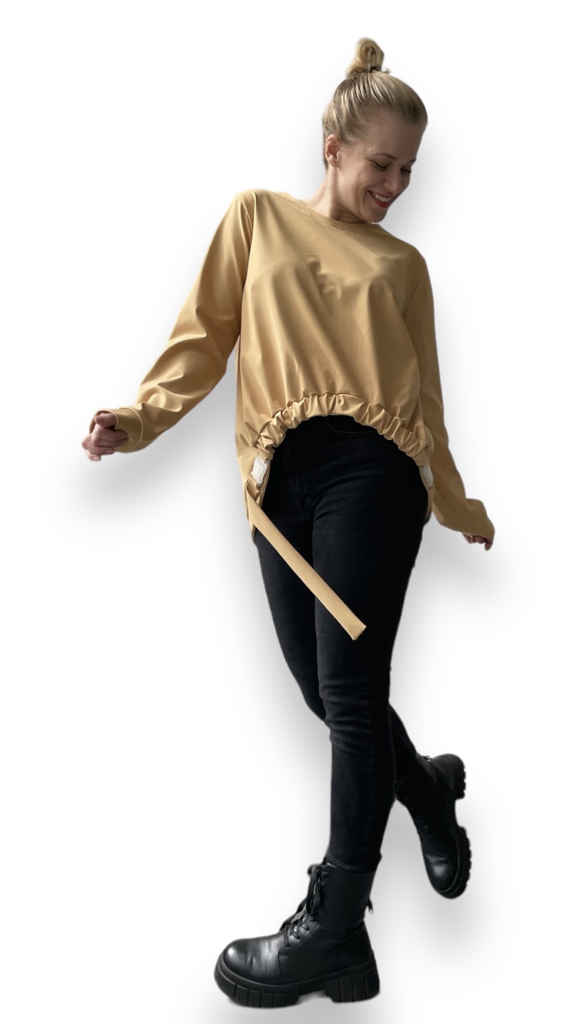 Volná dámská okrová mikina s kulatým výstřihem, nabíraným spodním lemem, delším zadním dílem. Materiál sportovní spandex! Jediná mikina z jiného, chladivého materiálu tohoto střihu.