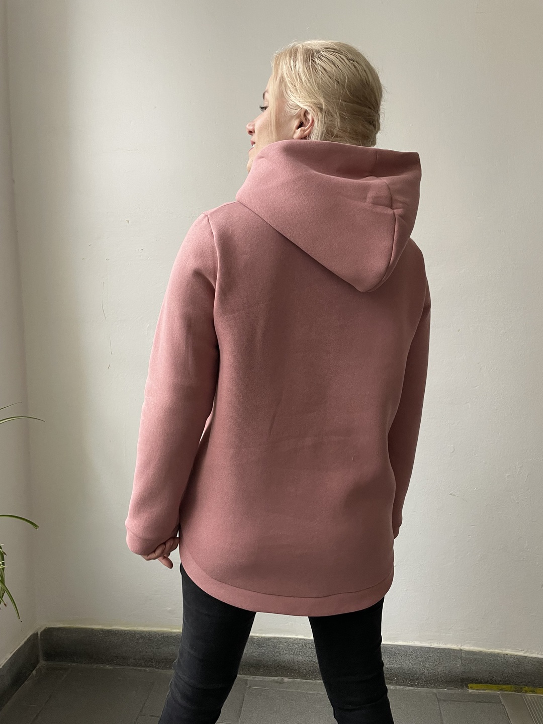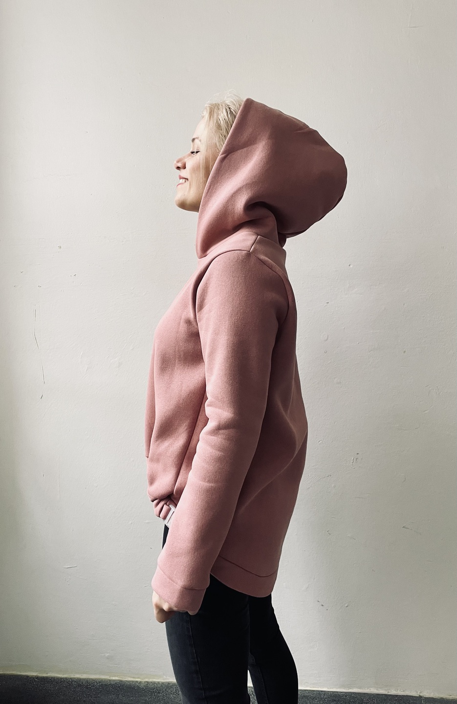 Volná dámská růžová mikina s kapucí, nabíraným spodním lemem, delším zadním dílem.
