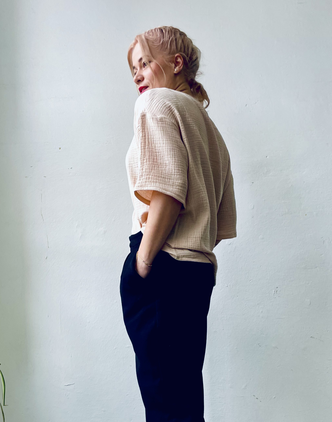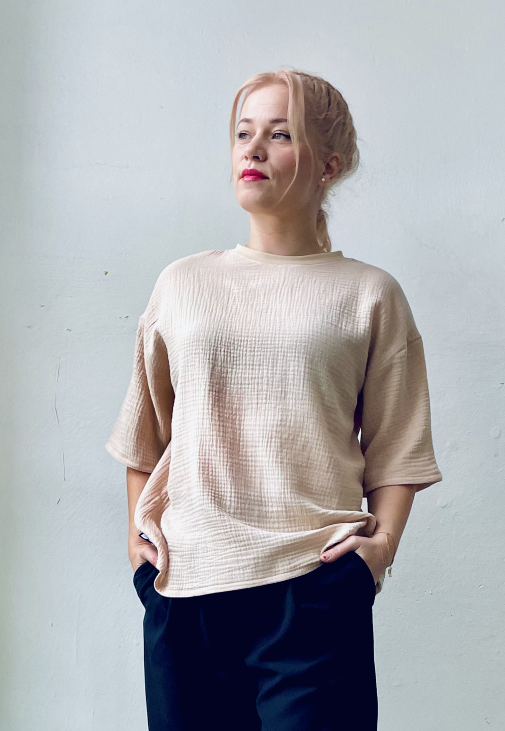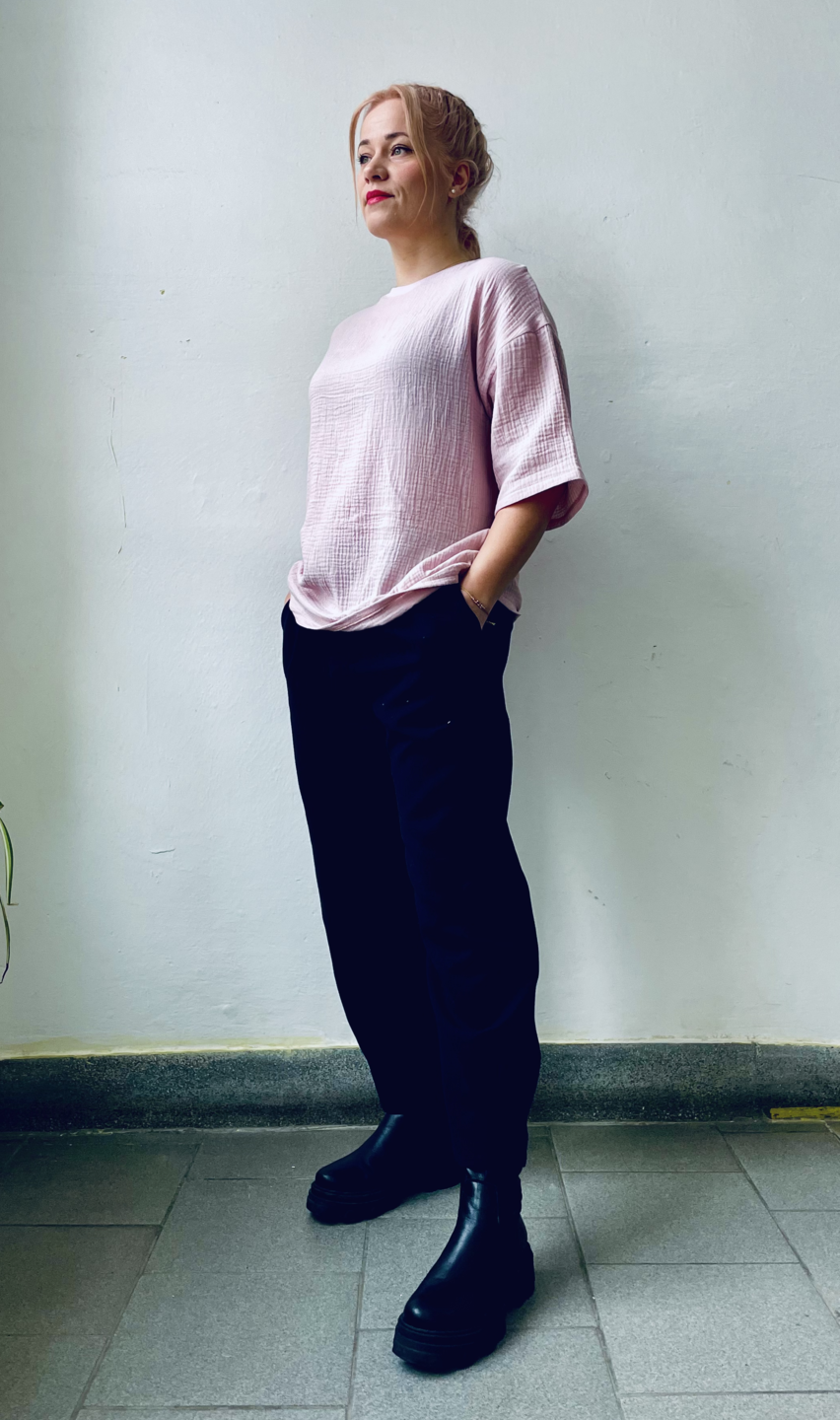 Pohodlné prémiové triko z přírodního materiálu 100% mušelín, oversize, jednotná velikost vhodná pro XS/L. Béžová.