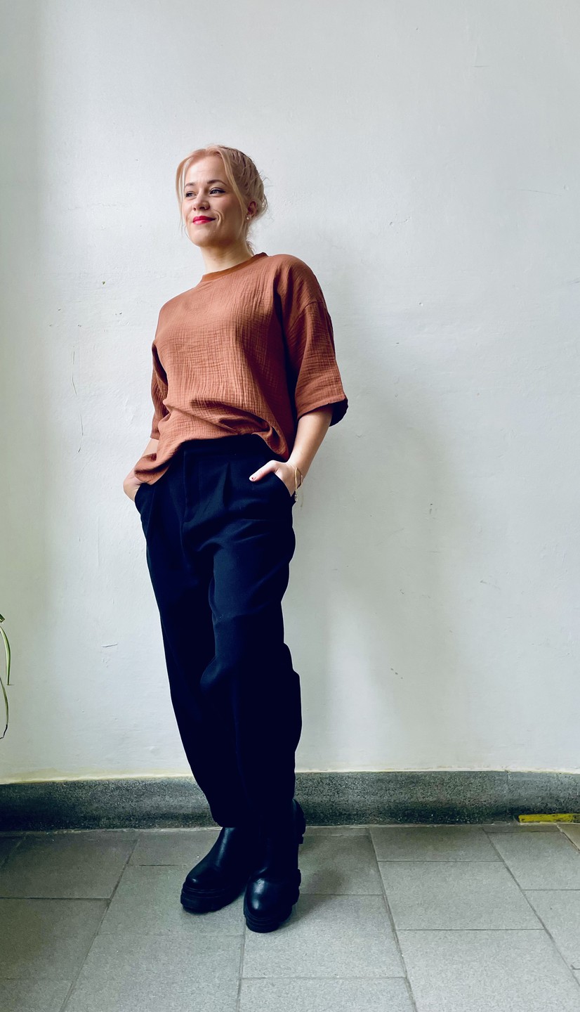 Pohodlné prémiové triko z přírodního materiálu 100% mušelín, oversize, jednotná velikost vhodná pro XS/L. Hnědá.